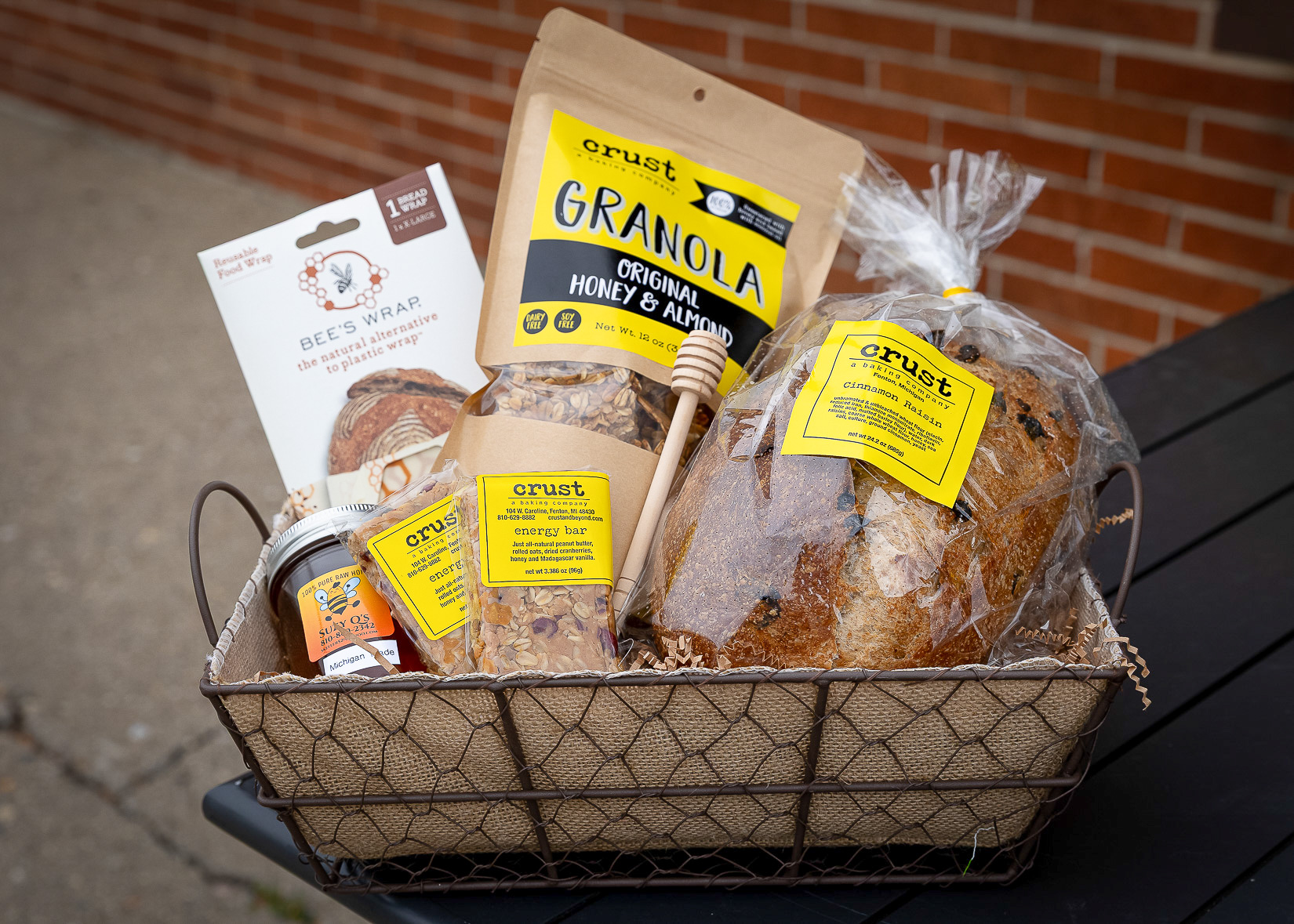This basket is jam packed with treats from the hive. Our Cinnamon raisin only sweetened with a pinch of honey, Local honey from St. Charles Michigan, a honey dipper, two energy bars, honey almond granola and a reusable Organic Bee’s wrap. Packed in a reusable burlap lined wire basket. Basket contains:
